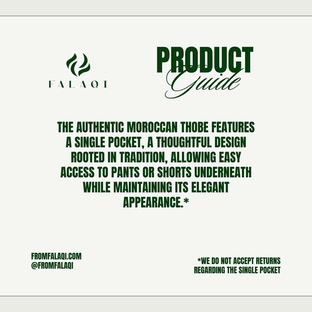 The Authentic Moroccan Thobe features a single pocket, a thoughtful design rooted in tradition, allowing easy access to pants or shorts underneath while maintaining its elegant appearance.